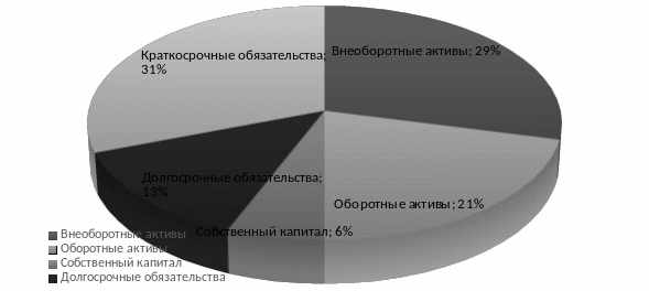 Рисунок – 1 Структура актива и пассива бухгалтерского баланса ОАО «Псковавиа» на 31 декабря 2014 г.