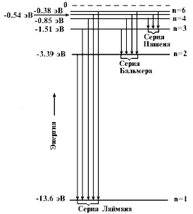 16.Изобразите на рисунке уровни энергии атома водорода и покажите переходы электрона, соответствующие серии Бальмера (см.Уровни энергии атома водорода).