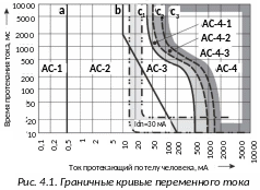На рис. 4.1 представлены граничные кривые переменного тока промышленной частоты (сообщение Международной энергетической комиссии (МЭК) 479 , глава 2, 3 - е издание 1994 года ), характеризующие воздействие электрического тока на человека в зависимости от продолжительности времени его протекания. Необходимые пояснения к рис 4.1 приведены в табл. 4.1.