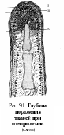 ном участке. В некоторых случаях отмечается посинение отмороженного участка кожи, а также окоченение области отморожения. Ни глубины некроза, ни его распространения в этом периоде определить не удается.