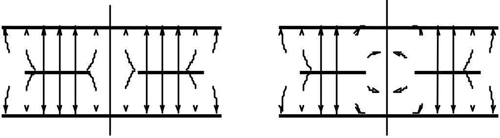 На рис.2.11 изображена конфигурация электрического поля в поперечном сечении связанной линии, показанной на рис.2.10 при возбуждении в ней четного (а) и нечетного (б) типов колебаний.