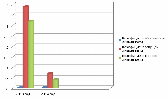 Анализируя коэффициент абсолютной ликвидности, за период 2013-2014, можно сделать вывод, что коэффициент увеличился незначительно на 0,01 или 150%, но то далеко от норматива, который составляет от 0,1-0,7. Данная ситуация, говорит о том, что предприятие не может погасить часть краткосрочных заемных средств.