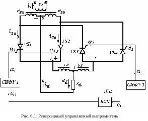 Различные типы силовых схем выпрямителей приведены в / 1, 5, 7-10/, принципы построения реверсивных схем управляемых выпрямителей и способы управления их вентильными комплектами - в /1, 7, 9, 10/. Согласование углов отпирания вентильными комплектами следует принять линейным.