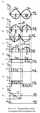 Диаграммы токов и напряжений элементов схем управляемых выпрямителей рассмотрены в /5, 8, 9, 10/.