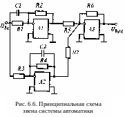 На рис. 6.6 приведена принципиальная схема, реализующая звено с передаточной функцией (6.7). На операционном усилителе А1 выполнена пропорционально-дифференциальная часть звена, на А2 апериодическая часть, а на А3 выполнено суммирование выходных напряжений пропорционально-дифференциальной и апериодической частей.