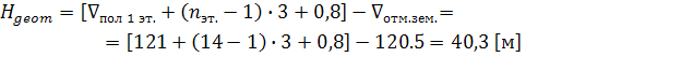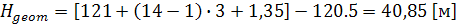 где, Нgeom – геометрическая высота подъема воды, равная разности отметки подвода воды к диктующему прибору и отметки земли в месте подключения ввода к городской водопроводной сети, м; ΣНtot.l. – сумма потерь напора в трубопроводах по длине и в местных сопротивлениях по расчетному направлению плюс потери напора в водомере, м; Hf - свободный напор на излив у диктующего прибора (определяется поприл.2[1]); Hg - гарантийный напор в наружной сети (по заданию 30 м), м.