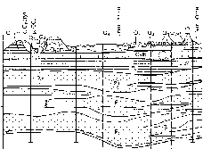 Как следует из определения, основной особенностью строения разреза артезианского бассейна является наличие слоистых толщ слабодислоцированных, преимущественно осадочных (реже вулканогенно-осадочных и вулканогенных) пород различного генезиса и состава. В связи с этим разрез бассейна всегда представляет собой многократное чередование стратифицированных гидрогеологических элементов, в качестве которых рассматриваются водоносные слои, горизонты, комплексы, реже водоносные серии, а также относительно слабопроницаемые водоупорные слои, пласты и толщи горных пород (см. гл. 6).