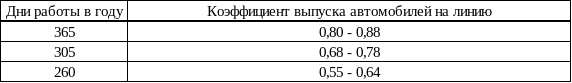Планируемое значение коэффициента выпуска автомобилей на линию может быть установлено в следующих интервалах в зависимости от предполагаемых дней работы в году: