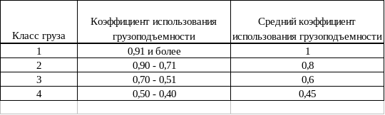 Все грузы в зависимости от величины использования грузоподъемности разделены на четыре класса. Сведения по значениям коэффициента использования грузоподъёмности приведены в таблице 6.