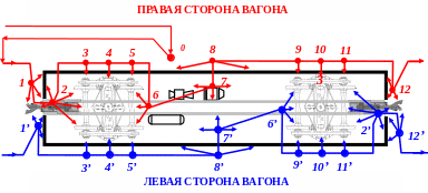 Остукивание колёсных пар производят на 3, 5, 9, 11, 3’, 5’, 9’, 11’ позициях.