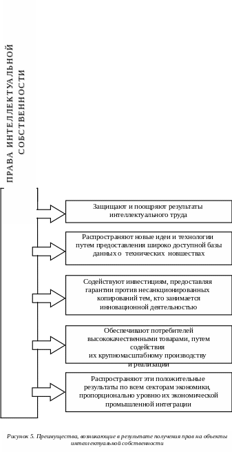 С точки зрения перспектив развития всей экономики показано, что при прочих равных условиях режим охраны прав интеллектуальной собственности и соответствующие положения, обеспечивающие их правовую поддержку, играют решающую роль в инновационном процессе. Сообразно двойственной роли этого режима выполняются две взаимодействующие функции: защитная – эксклюзивность, и информационная – дающая заряд для развития конкуренции. С точки зрения общего процесса приспособления рынка взаимосвязь инновации, эксклюзивности и конкуренции оказывает влияние на соотношение статической и динамической эффективности экономики.