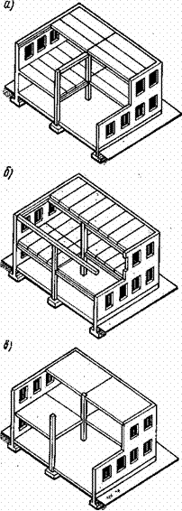 В зданиях и сооружениях с неполным каркасом (внутренним) все возникающие в них нагрузки передаются на внутренний каркас и наружные стены. Неполный каркас чаще проектируют для жилых и общественных гражданских зданий. В зданиях с полным и неполным каркасом ригели могут иметь продольное, поперечное или перекрестное расположение.
