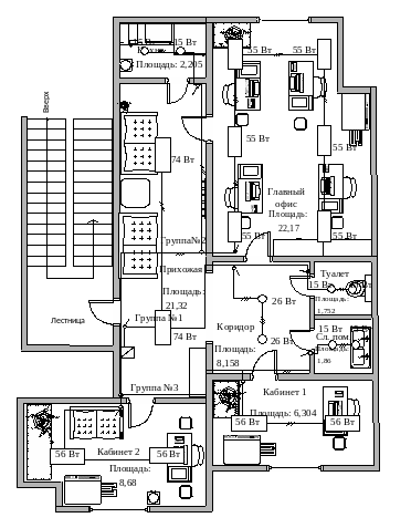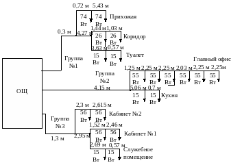 Рассмотрим схему осветительной сети офиса (рисунок 4). На схеме представлено расположение выбранных осветительных приборов, выключателей, щитка и проводов. Распределение нагрузки на группы представлено в таблице 6. Осветительная нагрузка разделена на три группы, таким образом, что мощность групп примерно одинакова. Линии групповой сети от щитка до светильников выполняются трехпроводными. Схематичное изображение осветительной нагрузки представлено на рисунке 4. На данном рисунке указаны значения нагрузок и соответствующих длин участков.