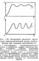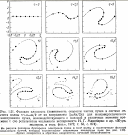 Эта оценка, основанная на наглядных физических соображениях, подтверждается графиком зависимости амплитуды волны от времени, полученным (при численном решении задачи с учетом нелинейных эффектов (рис. 1.20).Вначале происходит экспоненциальный рост амплитуды от теплового уровня, сопровождающийся бунчировкой пучка. В дальнейшем захват пучка волной приводит к стабилизации неустойчивости, осцилляции амплитуды поля в нелинейном режиме соответствуют фазовым колебаниям бунчейзахваченных в потенциальную яму волны, между тормозящими и ускоряющими фазами поля.