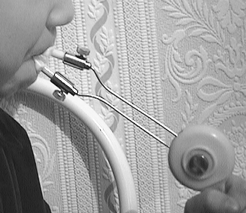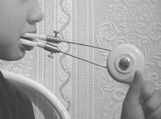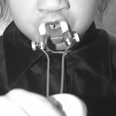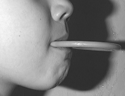 ●Упражнение для мышц, поднимающих нижнюю челюсть, – прикусывание палочки. Палочка с надетой на нее резиновой трубкой прокладывалась между боковыми зубами ребёнка и удерживалась в таком положении. Ребёнок сжимал и разжимал зубы, постепенно перемещая палочку по зубному ряду.