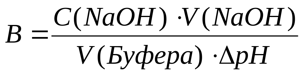 В одну колбу налить 10 мл ацетатного буферного раствора (рН = 5), в другую - 10 мл раствора НСl (С = 10-5 моль/л, рН = 5). В обе колбы добавить по 2-3 капли индикатора фенолового красного. Титровать 0,1 М раствором гидроксида натрия от лимонно-желтой окраски до розовой (рН = 8,4). Рассчитать буферную емкость буферного раствора по формуле: