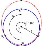 Радиус вектор точки падения равен радиусу Земли, величины и е найдены ранее. Разрешая это уравнение относительно Θ, получим два значения истиной аномалии. Одно выдаст калькулятор, второе, учитывая знаки косинуса по четвертям, присваиваем сами. Одно значение соответствует точке падения ИСЗ - К1 , второе – точке К2 – точке «вылета из под Земли». Радиус вектор этой точки тоже равен радиусу Земли. Из рисунка совершенно очевидно, что истинная аномалия точки падения обязательно больше 180 градусов. Такое значение и выбираем. Обозначим его Θ1 .