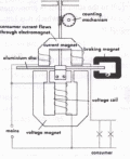The kind of meter nowadays generally used for alternating current is the induction meter (Fig. 3). It has no commutator. There are two electromagnets. The coil of one of these is energised by the consumer current; the other magnet coil is connected to the consumer voltage. If the current and the voltage in the consumer circuit are in phase with each other , then the current in the voltage coil, and therefore the magnetic field of this coil, will have a lag of one-quarter period (90°) in relation to that of the current coil. The interaction of the two coils produces a moving magnetic field which induces eddy currents in the light aluminum rotor disc. These currents cause the disc to rotate in the direction of motion of the moving field. The speed of rotation of the disc is proportional to the strengths of the two magnetic fields, but it is also dependent upon the phase displacement of these fields (and therefore upon the power factor cos ф). This will readily be understood when one considers the case where the consumer installation has a 90° phase displacement between V and I (i.e., cos ф = 0); when this happens the two magnetic fields in the meter will be in phase, so that the rotor will then cease to rotate. The braking magnet (on the right in Fig. 3) constantly produces eddy currents in the rotor; these damp the rotation and thereby ensure that the rotor stops instantly when the consumer current ceases to flow.
