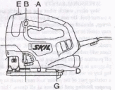 E Wheel for adjusting sawing speed F Lever for selecting sawing mode G Saw blade storage H Spotlight