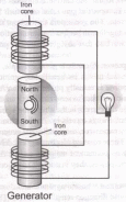 In the above diagram, you can see two magnets in the motor: The armature (or rotor) is an electromagnet, while the field magnet is a permanent magnet (the field magnet could be an electromagnet as well, but in most small motors it isn’t in order to save power). The principle design of the motor is identical to the generator. A generator produces an alternating current in the circuit it powers. This current flows in one direction as the magnet’s north pole approaches a coil and in the opposite direction as the south pole approaches it. To generate the 60 Hz alternating current used in the United States, the generator must turn 60 times each second so that the current completes one full cycle of reversals every l/60th of a second. In Europe, the generator must turn 50 times each second to supply 50 Hz alternating current. The generators throughout the continent-wide power distribution networks all turn together in perfect synchronization. That way, power can be redirected within each network so that any generator can provide the power consumed by any user.