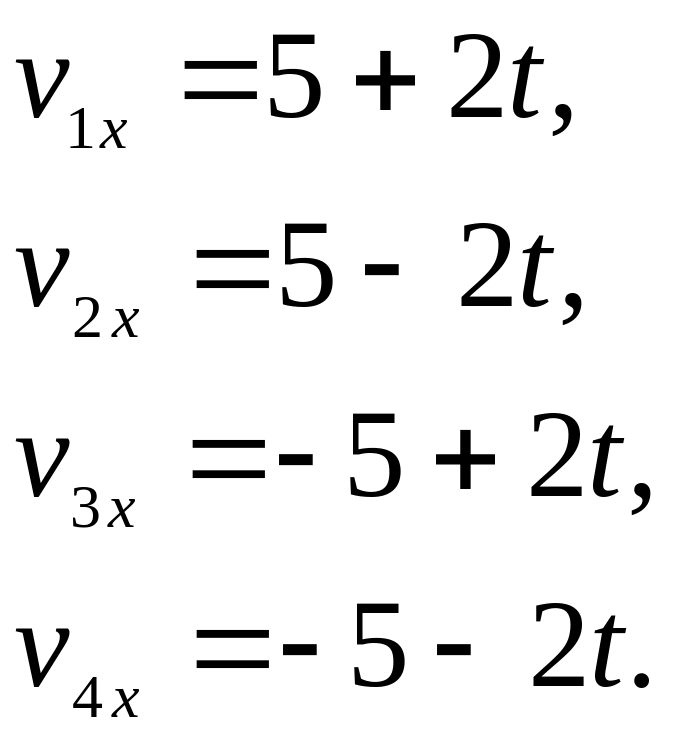 7 Заданы уравнения зависимости скоростей от времени для четырех тел. Определите характер движения каждого тела.