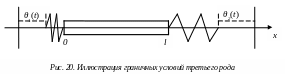 Граничные условия третьего рода могут быть представлены как условия, при которых к каждому концу стержня прикреплена пружина, другой конец которой перемещается вдоль оси по заданному закону времени θ (t), как это изображено на Рис. 20. Эти условия могут быть записаны следующим образом