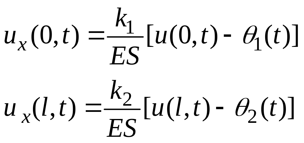 В граничных условиях II рода на концах стержня задаются упругие силы, образующиеся в результате деформации по закону Гука в зависимости от времени. Согласно формуле (66) эти силы с точностью до постоянного множителя равны производной ux, поэтому на концах и задаются эти производные как функции времени: