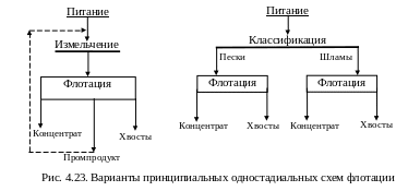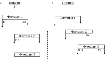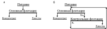 Если в цикле обогащения необходимо получить два конечных продукта – кондиционный концентрат и отвальные хосты, то применяются более сложные схемы флотации.