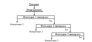 а) трёхцикловая с выделением в первой стадии обогащения части готового концентрата и богатых хвостов, направляемых в измельчение и вторую стадию. Во второй стадии обогащения выделяются вторая часть концентрата, часть хвостов и промпродукт, направляемый в измельчение и третью стадию обогащения;