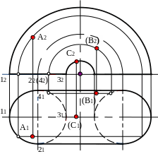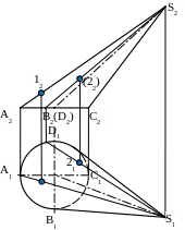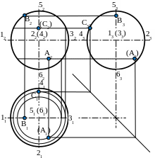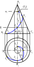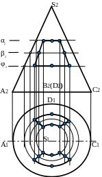 На рис. 21 показан пример построения горизонтальной проекции линии на поверхности конуса. Проекции точек 2 и 5 построены с помощью секущих плоскостей (α, β), точка 3 - с помощью образующей.