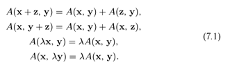 Числовая функция А(х, у), аргументами которой являются всевозможные векторы х и у вещественного линейного пространства L, называется билинейной формой, если для любых векторов х, у и z из L и любого вещественного числа λ выполняются следующие соотношения: