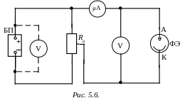 Соберите схему измерений согласно рис. 5.7. Обратите внимание на соблюдение полярности подключения фотоэлемента к источнику питания: анод фотоэлемента подключен к «плюсу», а катод к «минусу» источника напряжения (блока питания ИПС1) (прямое подключение фотоэлемента).