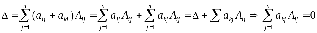 Доказательство. Рассмотрим определитель матрицы . Прибавим k-ю строку к i-й, отчего определитель матрицы не изменится в соответствии со свойством 6 . Теперь распишем по теореме 4.5 определитель новой матрицы, разлагая его по i-й строке. Получим: