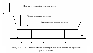 Общая кинетическая зависимость коэффициента трения при постоянных режимах представлена на рисунке 1.14. Здесь, как и на кривой износа, можно выделить три характерных участка: I приработочный, II стационарный и III катастрофический. I и III – это переходные процессы трения, в которых изменяются условия протекания. В I возмущение падает, в III – нарастает.