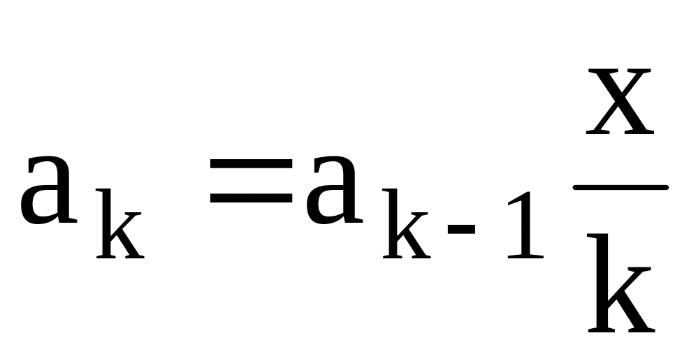 Здесь 2!=12, 3!=123, 4!=1234,… При суммировании подобного ряда главное, как и в предыдущем случае, наилучшая организация вычисления очередного члена ряда. Хуже всего было бы вычислять для каждого члена ряда отдельно числитель, т.е. соответствующую степень х, и отдельно знаменатель, т.е. соответствующее произведение. Мы поступим следующим образом. Обозначим общий член ряда: