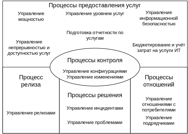 Согласно разделу ITSM (IT Service Management – сервисное обслуживание) ITIL для обеспечения надежной работы системы необходимо реализовать десять процессов сервисного технического обслуживания: