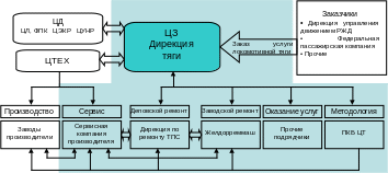 На рисунке: ЦД – Центральная дирекция управления движением, ЦЛ - Департамент пассажирского сообщения, ФПК – федеральная пассажирская компания, ЦЭКР – Департамент экономической конъюнктуры и стратегического развития, ЦУНР – Управление планирования и нормирования материально-технических ресурсов, ЦЗ – Дирекция тяги.