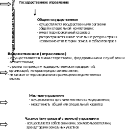 Общее государственное управление осуществляют государственные органы обшей и специальной компетенции. Оно имеет территориальный характер, распространяется на все земли в пределах определенной территории (РФ в целом, субъекты РФ, муниципальные районы, городские округа) независимо от категории земель и субъектов права на земельный участок.