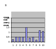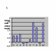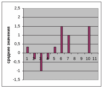 Рисунок 4 — Влияние желтого цвета на различные сферы организма юношей (1,2,3,4,5) и девушек (6,7,8,9,10). Параметры самооценки: 1 и 6 – настроение, 2 и 7 – эмоциональное состояние, 3 и 8 – интеллектуальное состояние, 4 и 9 – физическое состояние, 5 и 10 – уровень психофизиологического благополучия |