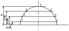Точки измерения 1-7 отмечены на дуге, имитирующей разрез полусферической поверхности с радиусом R=0,5м (рис. 11.3).
