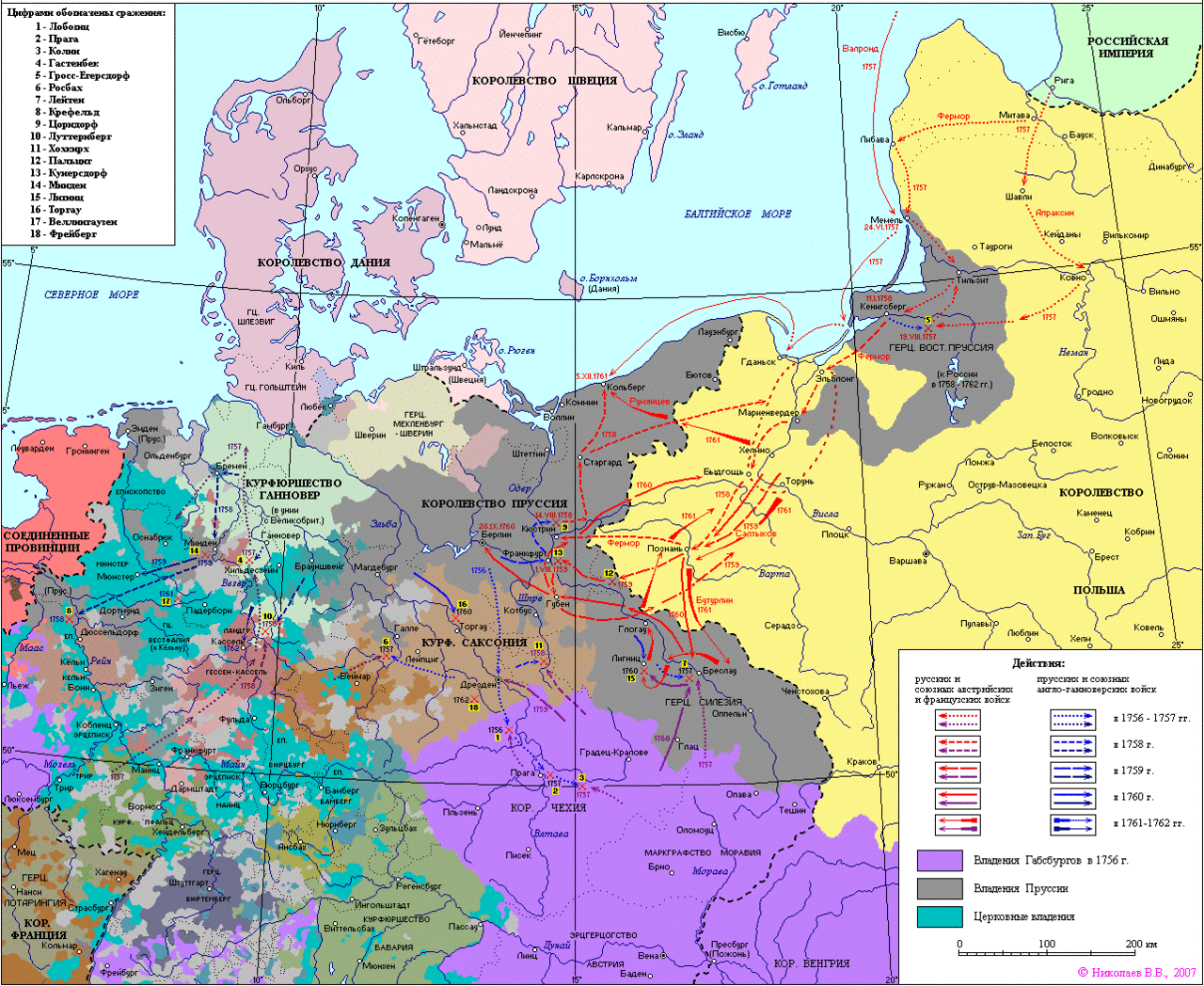 4. «Итак, нападения пруссаков можно было ждать каждую минуту. Русское командование не могло не понимать этого, и Апраксин приказал Веймарну и инженеру генералу де-Боске составить «ордер баталии» (боевой приказ) с тем, чтобы к утру раздать его генерал-аншефам. Тем не менее русское командование сомневалось в возможности генерального боя и, может быть, поэтому допустило ряд грубых ошибок. Поле сражения оставалось неподготовленным; не было принято мер, которые обеспечивали бы возможность быстро вывести войска и развернуть их в боевой порядок. Попрежнему не только не было сделано попытки занять Пушдорф и Норкитенский лес, что лишило бы неприятеля возможности использовать элемент внезапности, но даже не были посланы отряды для наблюдения за отступавшей прусской конницей. Русское командование ограничилось лишь выставлением сильного охранения у выходов на Егерсдорфское поле».