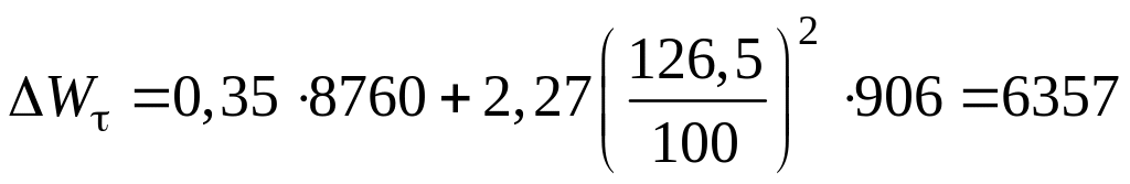 где Tmax годовое число часов использования максимума нагрузки [3, табл. 1.8]. Тогда, например, для ПС № 2 с трансформатором 100 кВ∙А и расчетной коммунально-бытовой нагрузкой 126,5 кВ∙А (Tmax = 2350 ч/год) получим (ΔРх = 0,35 кВт, ΔРк = 2,27 кВт) [2, с. 473]: