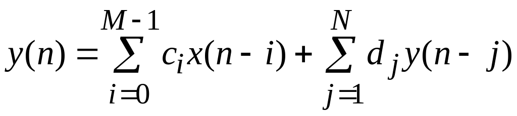 где x(n) и y(n) – отсчеты входного и выходного сигналов, ci и dj – константы, называемые коэффициентами фильтра, а M и N соответствуют количеству коэффициентов для первой и второй сумм.