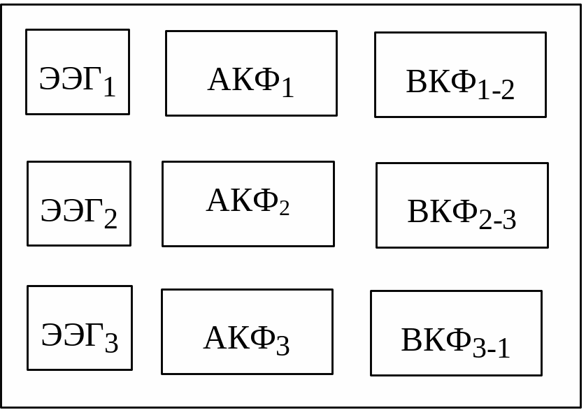 Создайте графическое окно, занимающее примерно 90 % экрана и содержащее девять полей для вывода графиков, расположенных в три колонки по три ряда в каждой. Назначение полей показано на рис. 3: ЭЭГi – сигналы, АКФi – их автокорреляционные функции, а ВКФi-j – взаимные корреляционные функции соответствующих сигналов.