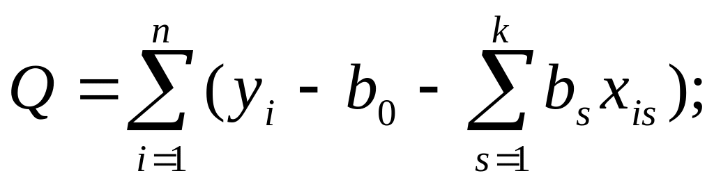 Для получения оценок коэффициентов b0,b1,b2,...,bk уравнения регрессии (5.1.2) используется метод наименьших квадратов [9]. Оценки bS, s=0,k получаются из решения систем уравнений, образованных приравниванием нулю частных производных по bS формы