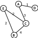 рассмотрим граф (рисунок слева), в котором 5 вершин (A, B, C, D и E); он описывается таблицей, расположенной в центре; в ней, например, число 4 на пересечении строки В и столбца С означает, что, во-первых, есть ребро, соединяющее В и С, и во-вторых, вес этого ребра равен 4; пустая клетка на пересечении строки А и столбца В означает, что ребра из А в В нет