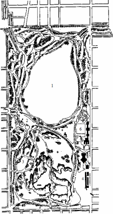 3 – беседки; 4 – кафе; 5 – музыкальный павильон; 6 – старое здание арсенала (ныне на территории зоопарка)
