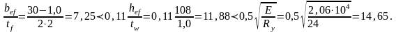Проверка показала, что устойчивость стенки обеспечена, хотя расстояния между рёбрами жёсткости а = 240 см >2hw=212 см.