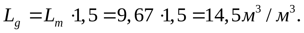 Для зниження теоретичної температури горіння газу до 1773 К і вмісту свобідного кисню в горнових газах на рівні 10%, приймаємо коефіцієнт надлишку повітря α = 1,5. Тоді, дійсна кількість повітря для спалення 1 м3 природного газу в горні складає: