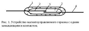 Геркон (ГЕРметичный КОНтакт) представляет собой стеклянный баллон 1 (рис. 1) с впаянными с противоположных сторон металлическими электродами 2, между которыми оставлен рабочий зазор 3. Внешние выводы 4 электродов служат для присоединения их к электрической цепи. В зависимости от мощности коммутируемой цепи длина стеклянного баллона составляет 8…80 мм, а его диаметр – 3…10 мм; выводы обычно имеют длину 8…20 мм.